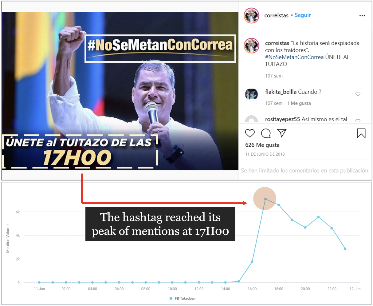 Un ejemplo de ello, de acuerdo con la herramienta de registro de tendencias de Twitter Trendinalia, el hashtag #NoSeMetanConCorrea, que fue promovido en Instagram por @correistas el 11 de junio de 2018, llegó a ser tendencia ese mismo día. El hashtag obtuvo 38.483 menciones, y el 10 por ciento de las cuentas más activas generó casi el 70 por ciento del volumen de publicación, lo que indica que un pequeño grupo de cuentas se coordinó en un esfuerzo por convertir este hashtag en tendencia.