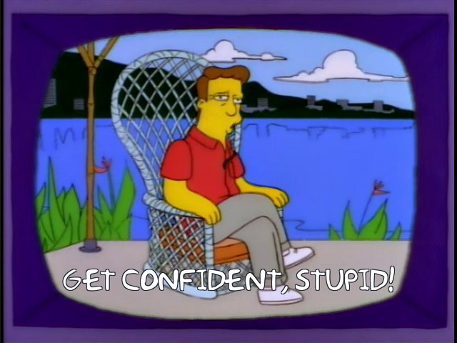 Reminds me of Troy McClure: https://frinkiac.com/meme/S05E07/483365.jpg?b64lines=R0VUIENPTkZJREVOVCwgU1RVUElEIQo=