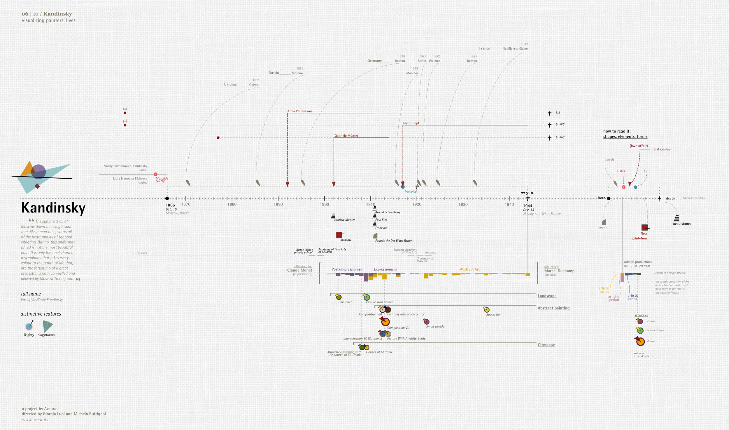А, с другой стороны, каждое визуальное резюме включает в себя, кроме дат рождения и смерти — браки, даты рождения детей и других членов семьи, путешествия, периоды вдохновения любимыми женщинами и влияние современников, выставки, периоды наивысшей творческой работоспособности, доминирующую цветовую гамму картин и др.