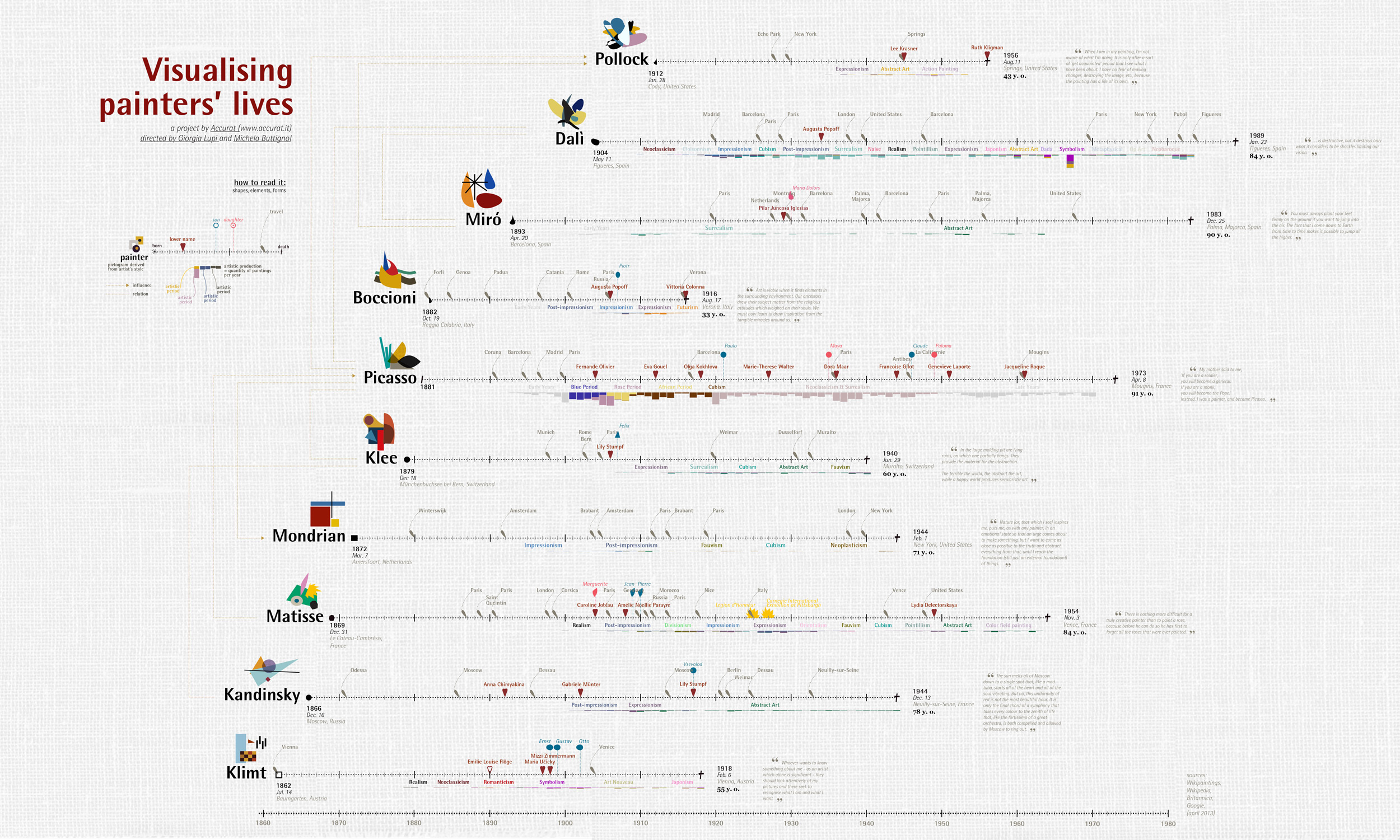 В 2013 г. назад итальянский информационный дизайнер Giorgia Lupi (Бруклин), сооснователь и дизайн-директор Accurat вместе с Michela Buttignol Illustrator (Нью-Йорк) начали работу над визуализацией, описывающей “линии жизни” художников конца 19 в., оказавших огромное влияние на саму технику упрощения и визуализации.