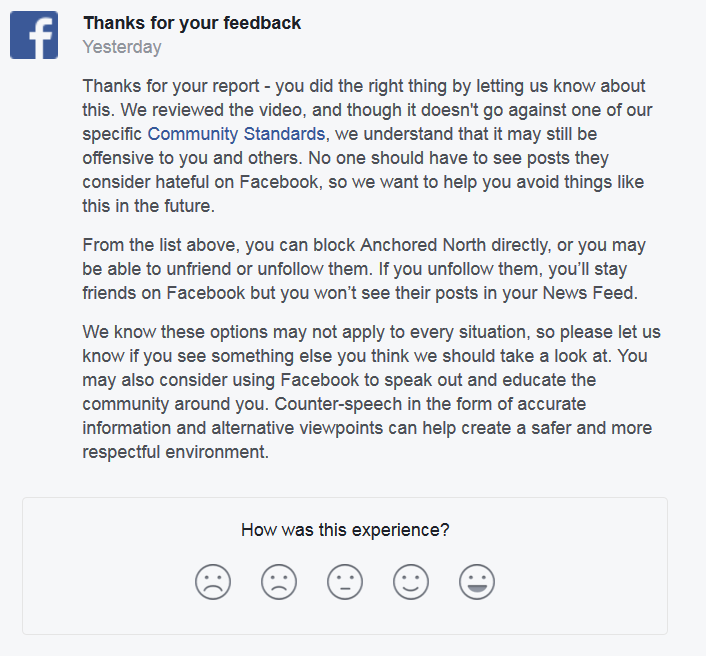 Surprisingly, Facebook responded to the series of complaints with the same response: targeting gay people to tell them they’re going to hell does not violate the platform’s guidelines aimed at curtailing hate speech and harassment.