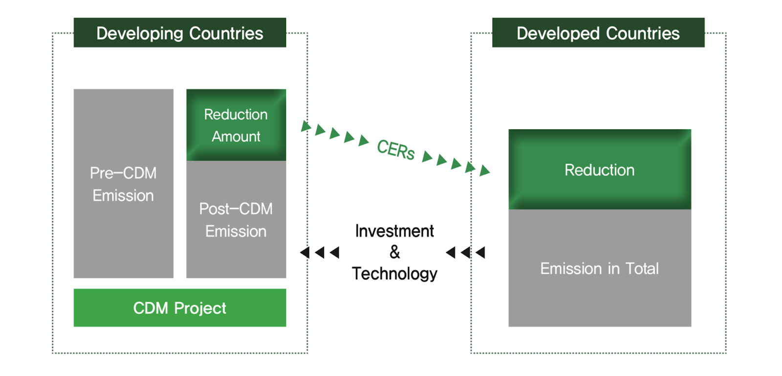 According this Kyoto Protocol Article, developed countries must reach a given GHG reduction amount target. Developing countries do not have such obligation. When developed countries, with obligation to reduce GHG, invest in developing countries and execute GHG reduction activities, the reduced GHG amount can be accredited. This is called as Clean Development Mechanism (CDM) because developing countries can have foreign investment and eco-friendly technologies.