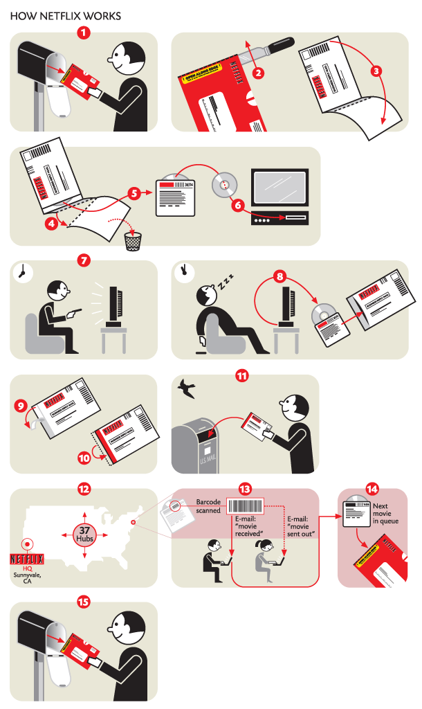 There are, however, examples that prove Holmes’ approach can have its value. His Netflix illustration comes to mind as an example when ‘fancy design’ can help tell the story (or even tell it without the need for words). Holmes achieved to explain the process of renting DVDs almost without using any words. Instead, he used a sequence of graphics that show the process more effectively than words could ever do.