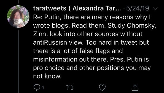 And just to make sure folks don’t forget, she is very pro Putin. No, she was not researching a novel it seems. Her NEW statement is that the pro Russia and pro Putin tweets were only because she was writing a Russian novel and while researching it she disowned her pro Putin talk. This is very convenient isn’t it ? Because she has discussed in her tweets that she came to her pro Putin positions AFTER reading books and after over a decade of Putin disruptive acts, election interference and pushing disharmony. After all that she came to a Pro Putin position so conveniently disowning her pro Putin and pro Russian position just as her accusations are made more public is not going to fly which is a major red flag again not only because of these positions but showing her consistency of shifting positions and telling new stories.