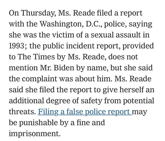 Update 1 : Tara Reade has filed a criminal complaint to DC police. It’s also criminal to file a false criminal report.