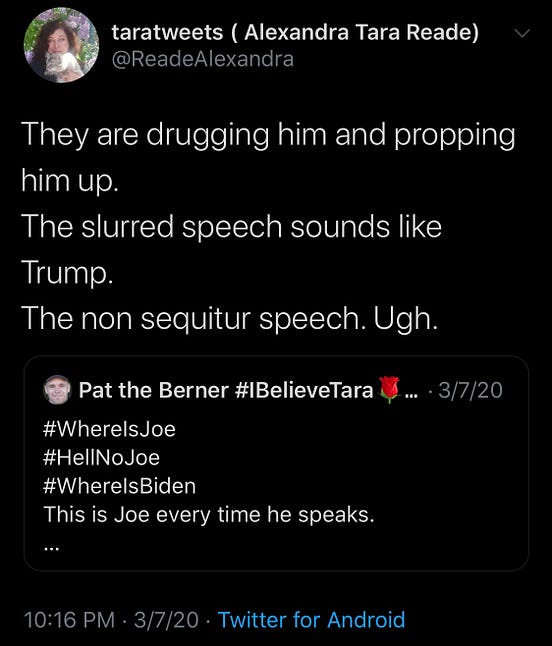 By March 7, 2020 saying Biden is being drugged and propped up . You noticed her tweets start to become unhinged and into conspiracy theories now