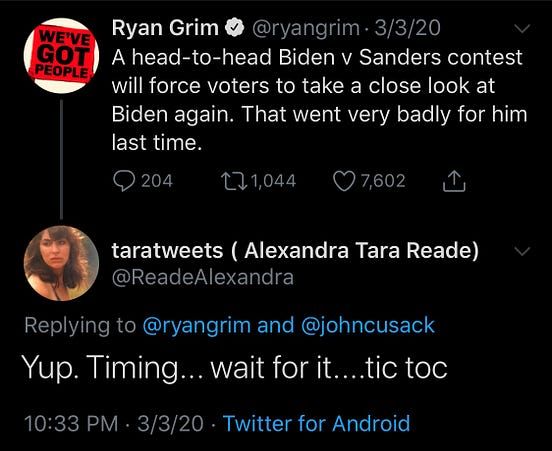 As you will see it was all about timing for Tara Reade in her own words. She changed her story completely from 2019 and the new 2020 story was about getting rid of Biden. In her own words, “tic toc”, it is about timing (March 3, 2020, 20 odd days before the intercept article. The reply is to Ryan Grim, the author of the intercept piece which triggered the 2020 new story