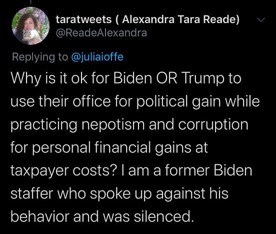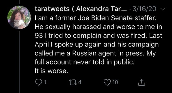In fact from April 2019 to March 2020 she tweeted hundreds of times despite her story being made public. Apparently making it public wasn’t enough as per her tweets as she didn’t get the attention she said she deserved. The only time she did get attention is when her story changed in 2020 and she went from non sexual behaviour from Biden to Rape. If it’s true that she changed her story from 2019 to 2020 because she wanted more attention she essentially weaponised the #metoo movement for her own personal and politics gains