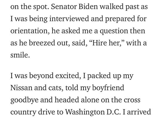 However in her 2019 accusation medium article she writes that she drove cross country to start her new job for Joe Biden in 1993