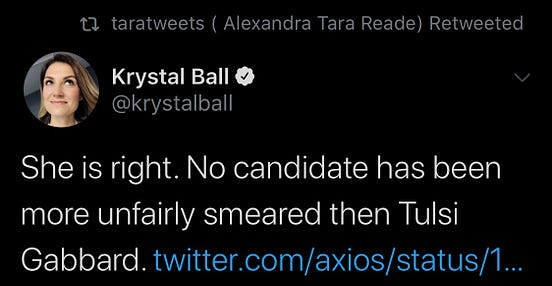 Defending Tulsi when Hillary called Tulsi sympathetic to Russians and republicans. Note that Krystal Ball is the hill tv interviewer who had the Skype interview pushing Tara Reid’s story today
