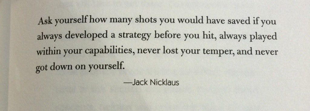 As I made the turn in the first round, I realized that I didn’t have that anxiety anymore. There was no fall season to prepare for. I found that I wasn’t analyzing every part of my game and worrying about what I was doing poorly or doing well. It felt freeing, honestly. The impact this realization had on my play in the Member-Member was noticeable. I shot even on the backside to finish with a 74. The next day, I fired a bogey-free 69. Two great scores for me. It seems that I finally got around to listening to that Jack Nicklaus quote…