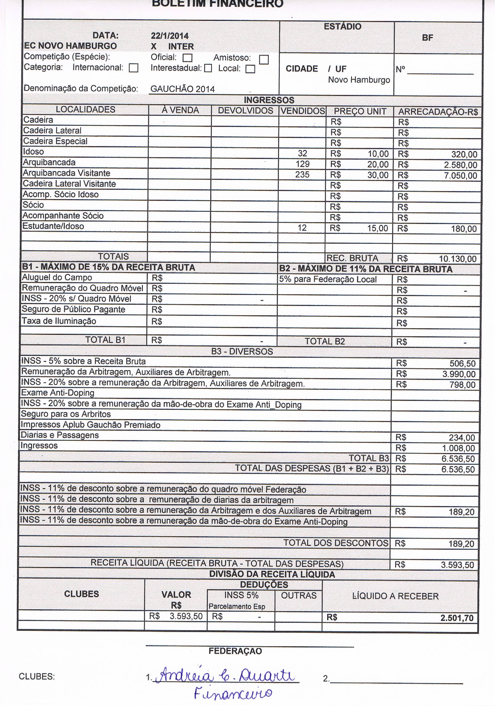 Cartões amarelos: Aylon 9min/1ºT, Raphinha 9min/1ºT, Fernando Baiano 18min/1ºT, Jean 26min/1ºT, Cláudio Winck 37min/2ºT, Alex Santana 45min/2ºT, Murilo 48min/2ºT (S.C. Internacional); Fred 12min/1ºT, Rafael Mineiro 22min/1ºT, Anderson Pico 1min/2ºT, Jonatas Belusso 19min/2ºT, Luis Henrique 32min/2ºT (E.C. Novo Hamburgo)