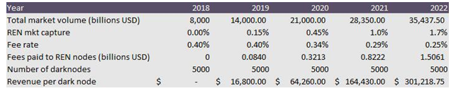Finally, by dividing our total network cash value (4,696,668,753) by the number of circulating tokens (519,094,022), we arrive at a dollar price per REN of 9.05 USD. That is, with our assumptions and best case scenario forecasts, REN should be valued at 9.05 USD per token.