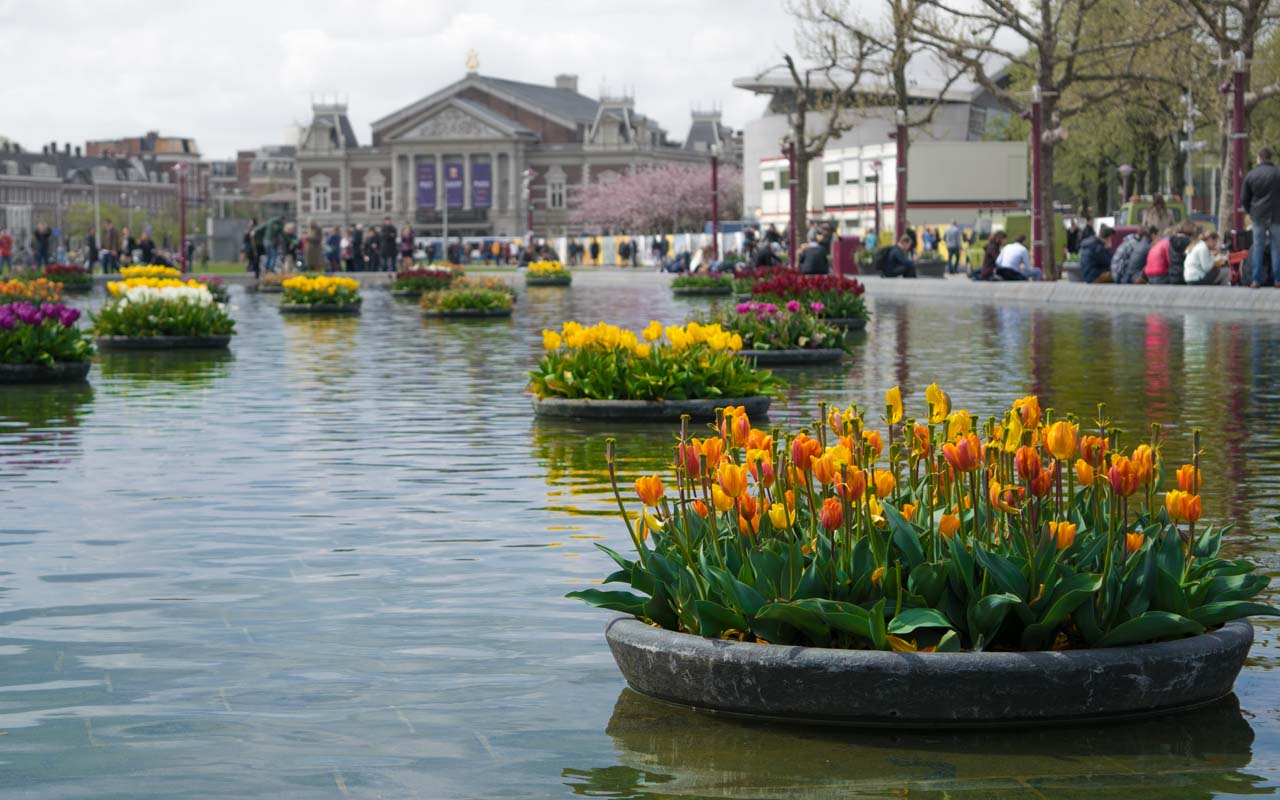 O que chamava a atenção de tanta gente para o lado oposto era o letreiro gigante com os dizeres ‘I AMSTERDAM’ bem em frente ao Rijksmuseum. Não que o letreiro não me encantasse, é bem bonito realmente, mas as cores vivas e quentes das flores nesse espelho d’água quase que gritavam por um pouco de atenção naquele dia frio e de vento cortante. Não pude resistir ao chamado delas e o que acabou acontecendo foi que não tenho nenhuma foto na frente do tal letreiro.