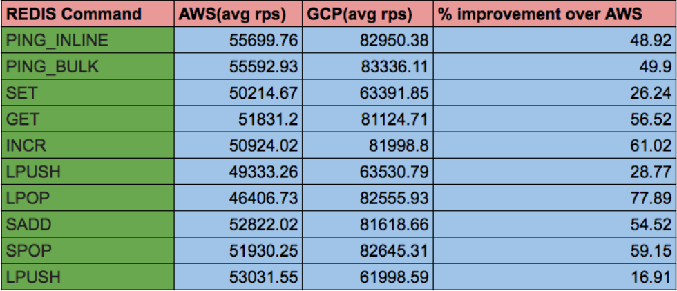 Redis benchmark tests were run across a cluster of 6 instances (8 core, 30GB each). From the results below, we concluded that GCP provides up to 48% better performance (on average) for most REDIS operations, and up to 77% better performance for specific REDIS operations.