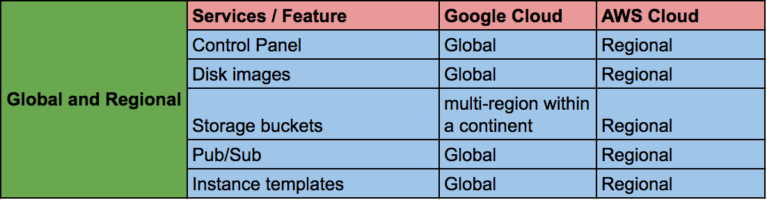 In Google Cloud most resources are either Global or Regional. This includes things like the control panel (where we can see all of our project’s VMs on a single screen), disk images, storage buckets (multi-region within a continent), VPC(but individual subnets are regional), Global Load Balancing, Pub/Sub etc.