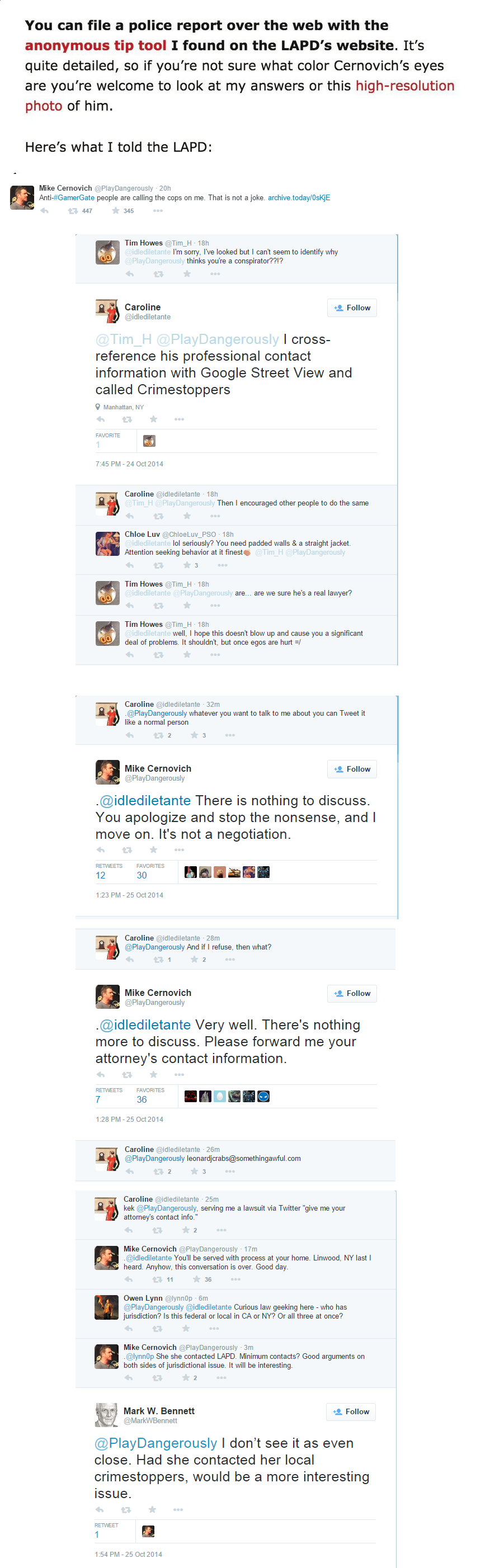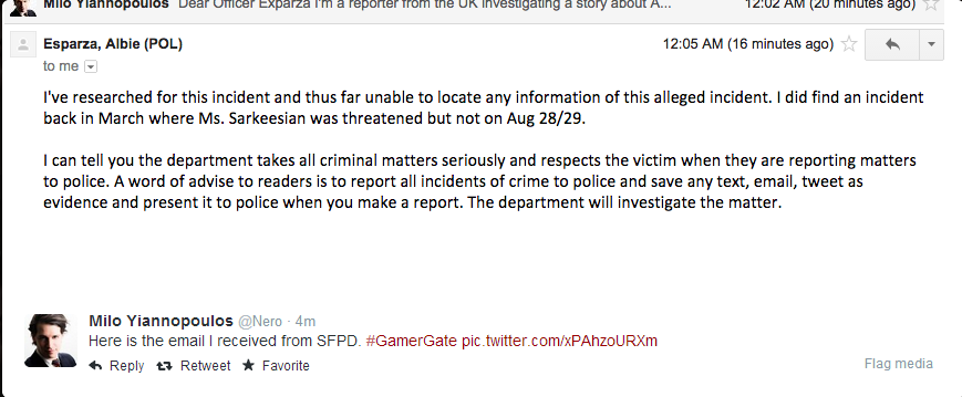 While I believe there were a fair amount of vitriol contributed by both sides, the only presented evidence of serious threats made by #gamergate — beyond anecdotes — was one screenshot of death and rape threats made by one psycho. And the evidence is hardly indubitable. More damning is the fact that the San Francisco Police Department has confirmed to Milo Yiannopoulos that it received no complaint from Anita Sarkeesian in August, as she claims. Later, the SFPD did confirm to Milo that the FBI was handling a case involving her. However, there was no confirmation as to whether it pertained to the August incident or an earlier incident involving a bomb threat in March.