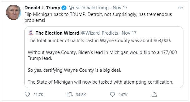 Trump considered his 70,000 lead very large in 2016 but he thinks Biden’s 81,000 vote lead this year is fraudulent.