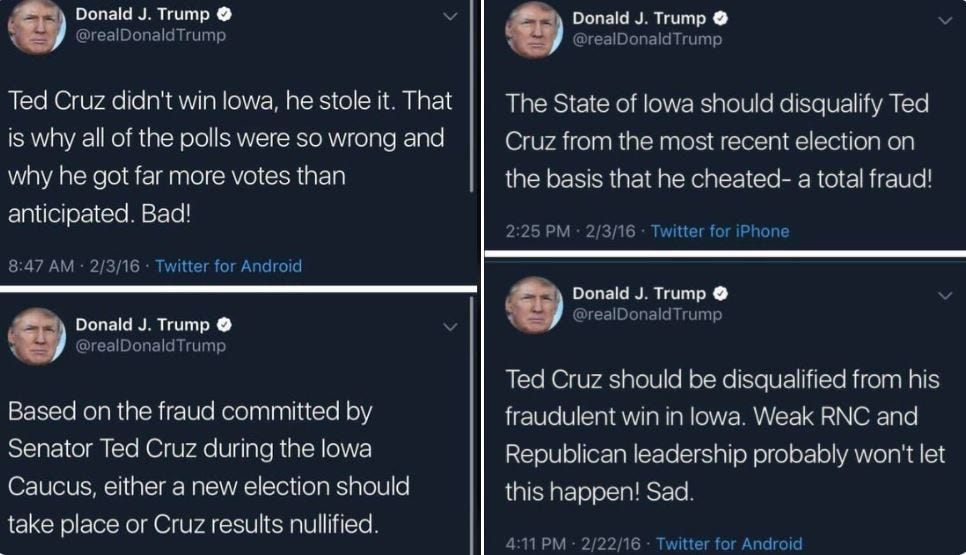 The first thing to notice is that Trump has tried this act before. When he lost to Ted Cruz in the Iowa caucuses, he called the results fraudulent: