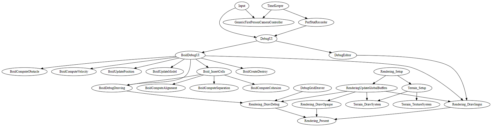 These systems ultimately generate a graph. In that graph, every node will only execute as soon as all nodes it depends on are complete. Here’s a graph of a test game we wrote that simulated Boids.