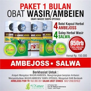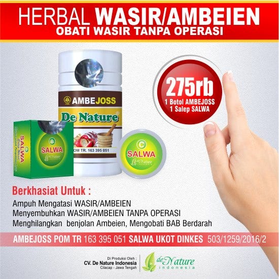 Salah satu Herbal untuk mengatasi penyakit ambeien adalah produk dari De nature Indonesia paket herbal ambeien/wasir Kapsul AMBEJOSS dan Salep Salwa, paket herbal untuk penyakit ambeien yang terbuat dari bahan alami dan aman di konsumsi karena terdaftar di BPOM