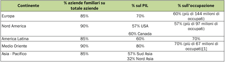 In Italia si stima che le aziende familiari siano circa 784.000 — pari ad oltre l’85% del totale aziende – e persino in termini di occupazione circa il 70%. Sotto il profilo dell’incidenza delle aziende familiari, il contesto italiano risulta essere in linea con quello delle principali economie europee quali Francia (80%), Germania (90%), Spagna (83%) e UK (80%), mentre l’elemento differenziante rispetto a questi paesi è rappresentato dal minor ricorso a manager esterni da parte delle famiglie imprenditoriali: il 66% delle aziende familiari italiane ha tutto il management composto da componenti della famiglia, mentre in Francia questa situazione si riscontra nel 26% delle aziende familiari ed in UK solo nel 10%.