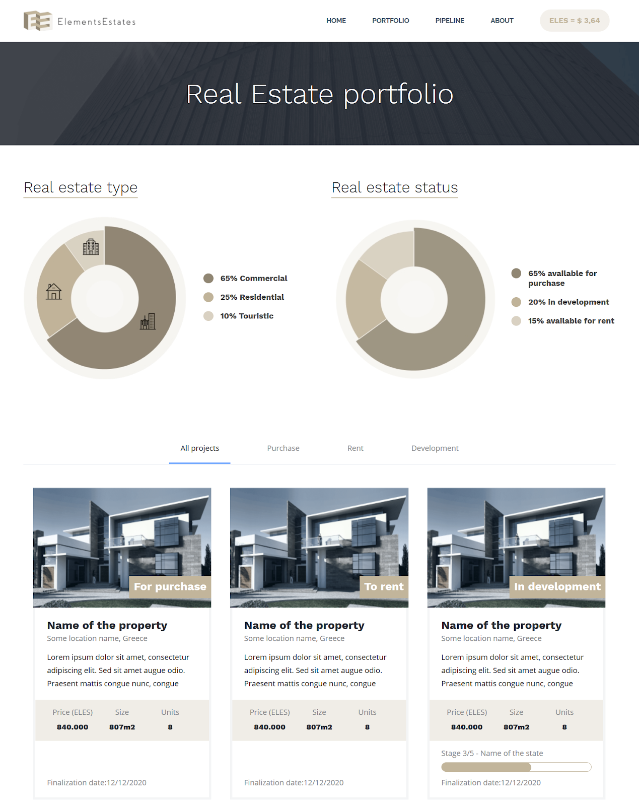 The Homepage is a global map of the SEE region with map markers highlighting the location of real estates in the Elements Estates portfolio. In the near future, this will be an interactive map showing all the real estate properties. The ‘current’ market value of ELES token is displayed at the bottom alongside its daily market volume on exchanges, the number of tokens in circulation responsible for that volume, and the value of tokens locked in the Fund pool (note: these numbers don’t represent the current rates and value, these numbers currently function as an example until the final platform will be live. Users can also quickly acquire ELES tokens through third-party merchant service integrated on the platform by clicking “Exchange Tokens”.