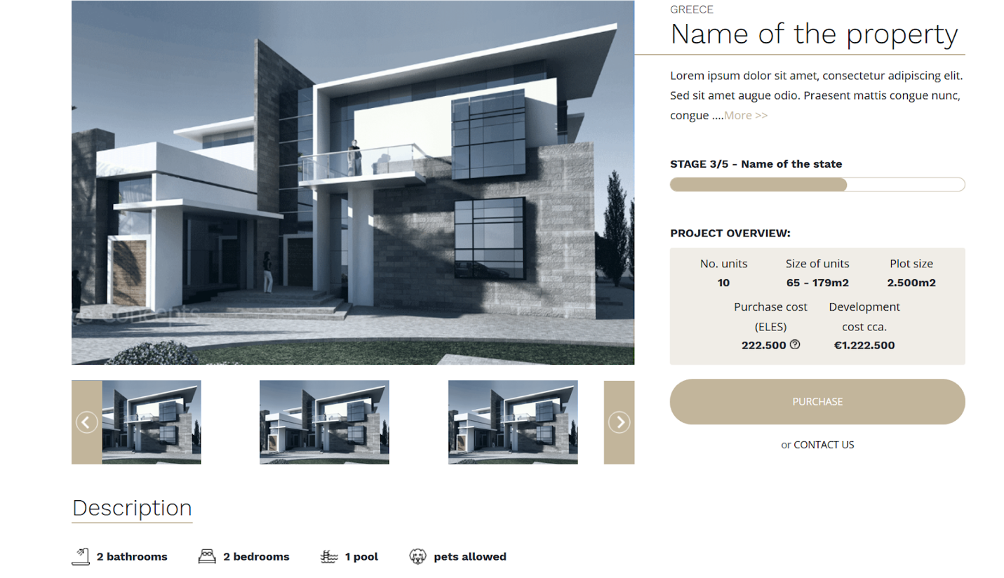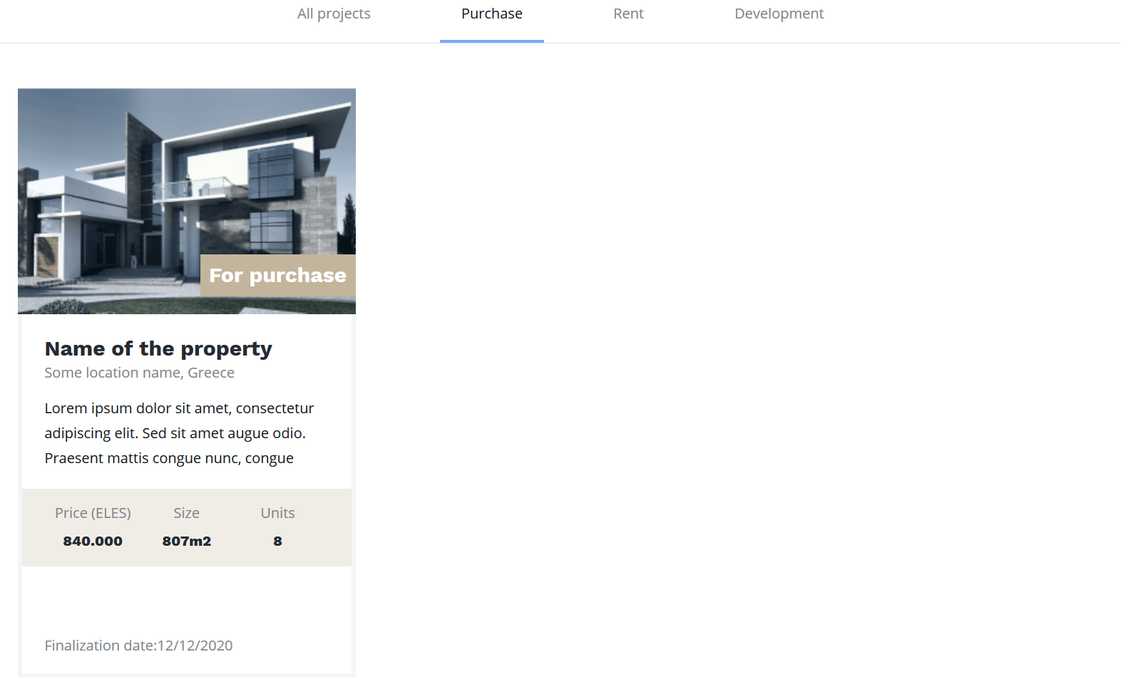 The Purchase menu is the marketplace for accessing properties available for purchase. A preview of the location, features, price in ELES tokens and finalization dates of the property can be accessed on the first page with more detailed information and documentation made available by clicking on the property.