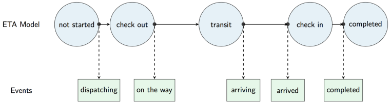 The two subproblems are captured in the five states of our ETA model: not started, check out, transit, check in and completed. When the task is being prepared at point A, it is in the check out state. The task then moves to transit, when the driver is traveling from A to B. On reaching B, the task goes into the check in state. Transitions between these states trigger events.